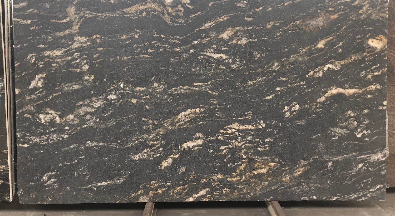 Black Cosmic Leatherlook is een opvallende natuursteen met een unieke combinatie van elegantie en karakter. De diepe zwarte basis, doorweven met levendige goud- en witte aders, creëert een kosmisch patroon dat direct in het oog springt. Dankzij de leatherlook-afwerking krijgt het oppervlak een matte, tactiele textuur die warmte en diepte toevoegt aan het geheel.